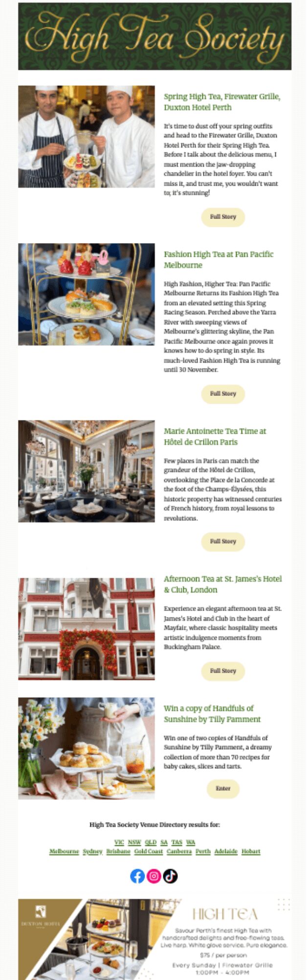 We publish a monthly email newsletter that features high tea reviews, news, recipes and competitions. Subscribe to either the Australia/New Zealand or UK editions.