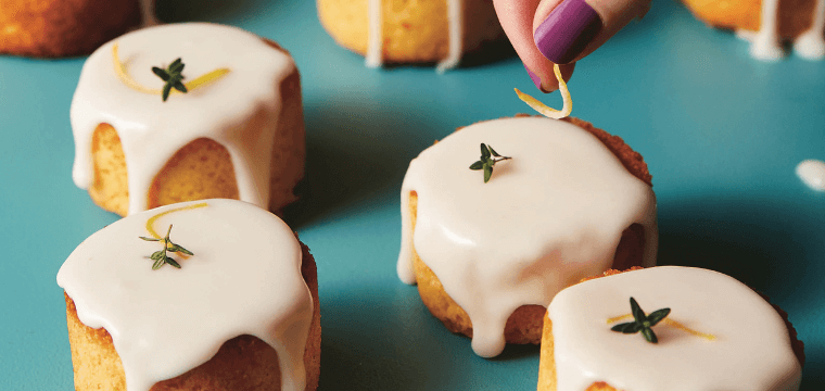 - Place a tablespoon of the glaze over the top of each cake and let it run slowly down the sides before topping with lemon thyme flowers and a twist of peel to garnish.