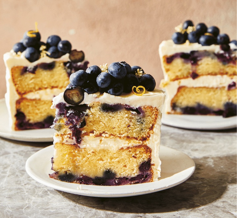 - Use a serrated to knife to level the tops of the cakes, if needed. Put one of the cakes on a serving plate and spread it with about a third of the icing. Add the second cake and spread the remaining icing all over the top and side. Garnish the cake with the fresh blueberries and lemon zest.