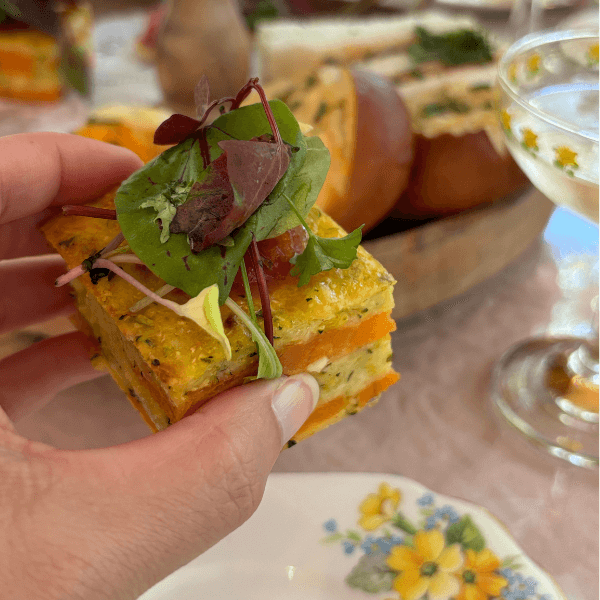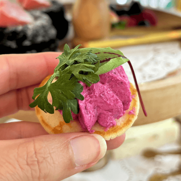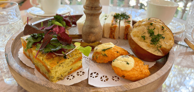 Our Luxe High Tea arrived on a statuesque, three-tiered rustic timber stand, befitting the venue’s country setting. Starting with the savoury items including a beetroot mousse blini, with the beetroot adding a vibrant pop of colour and flavour, while a delicate potato rösti provided a satisfying crunch. The turkey and cheese baguette was beautifully balanced, topped with fresh garden herbs, and the classic finger sandwiches were perfectly executed – light, fresh, and generously filled. The standout was a sweet potato frittata, topped with fresh salad leaves creating a warm, hearty bite that was both comforting and flavourful.