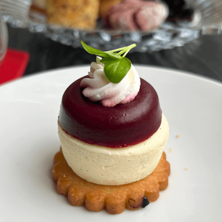 A few moments later, our server brought us a plate of perfectly warm scones with Devonshire cream and berry confiture. You can ask for more cream and jam if you run out, but we both felt pretty full after our first scones, despite skipping breakfast. By the time the tea arrived, I was stuffed, but determined to try every beautiful pastry on the platter. Fortunately, fantastic flavors like blood orange, morello cherry, and luxe chocolate made the task a lot easier.