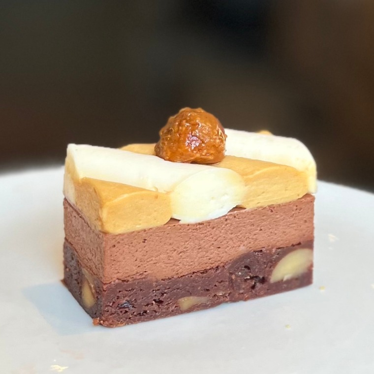 - Macadamia brownie, caramel, chocolate mousse, white chocolate cream