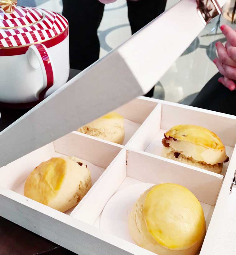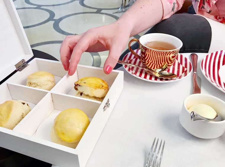 We sat in comfortable, high-backed arm chairs which gave us a feeling of privacy even in a big room and used bone china bespoke to the venue at a crisp white linen covered table. Created by British designer Richard Brendon, the china complimented the huge circular Baccarat crystal chandelier hanging in the lounge like a, yes, crystal moon. The red spot in the middle of the chandelier represents the heart and passion of the hotel and Brendon’s collection reflects this with one place setting of china per group being striped red rather than grey. It’s not the only this his work reflects – the mirrored surface of tea cups reflect the striped red or grey lines of the saucer it sits in.