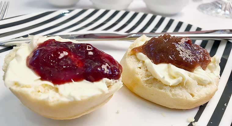 - Plain and sultana scones served with rhubarb and tonka bean jam, strawberry jam and Cornish clotted cream.