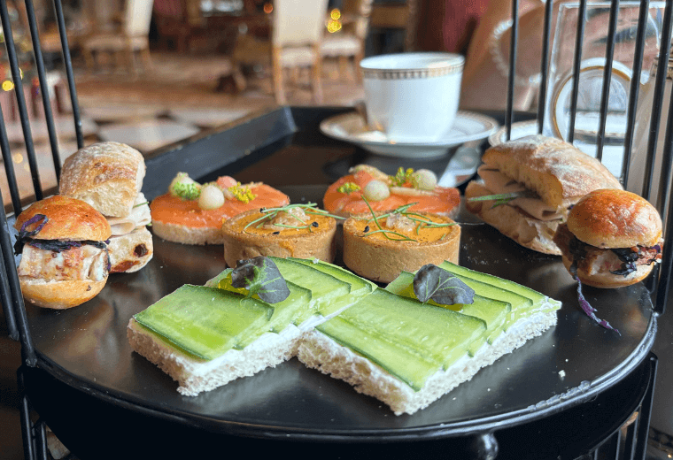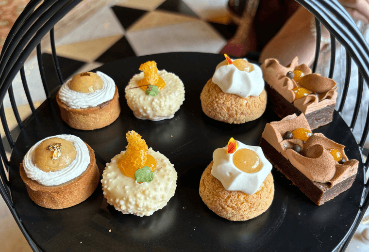 We’re presented with a beautiful menu featuring a sweet drawing of tea and books on its cover and eagerly scan the menu for what’s in store. The Afternoon Tea service starts with a seasonal amuse – in this instance, decadent caviar topped blinis, the perfect pairing with Nicolas Feuillatte Champagne. The three-tiered birdcage-style high tea stand arrives, laden with an array of delectable treats.