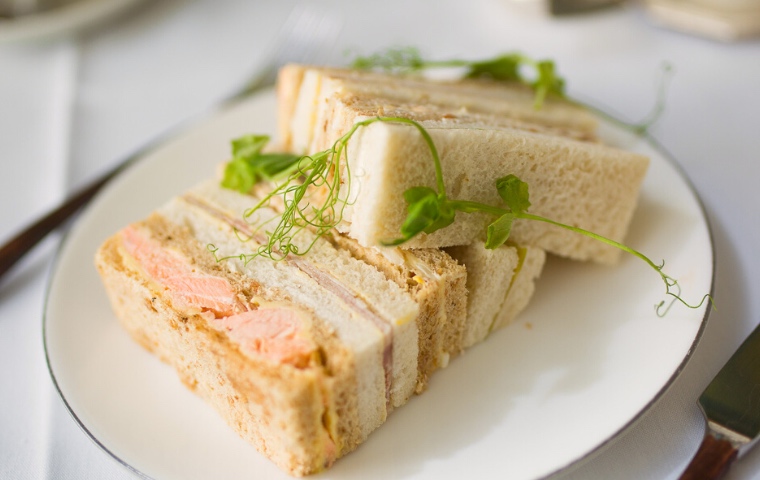 Served on Wiliam Edwards fine bone china from the Reed collection, guests are welcomed with a freshly baked pork and leek sausage roll in buttery flaky pastry and a sun blush tomato, smoked cheese and rocket quiche. Both pastries are melt-in-your-mouth and set the scene for the afternoon tea to follow. Inspired by the natural beauty of the English countryside and featuring vibrantly hand-painted illustrations of iconic wetland birds and insects, the Reed collection is delicately edged in 24-carat gold. Whether guests choose one of the bespoke Grand Hotel blends, or a traditional tea or infusion from the Kent and Sussex Tea company, they will be charmed by the adorable details on the teacups, as well as the silver teapots and serveware as they move onto the three tiered tea stand of delights. We chose the signature Grand Blend which was well balanced, and enjoyed without need for sugar or milk. With a classic selection of sandwiches, guests enjoy poached fresh salmon, cucumber and mint cream cheese, ham and English mustard and egg mayonnaise and cress from the lowest tier of the tea stand.