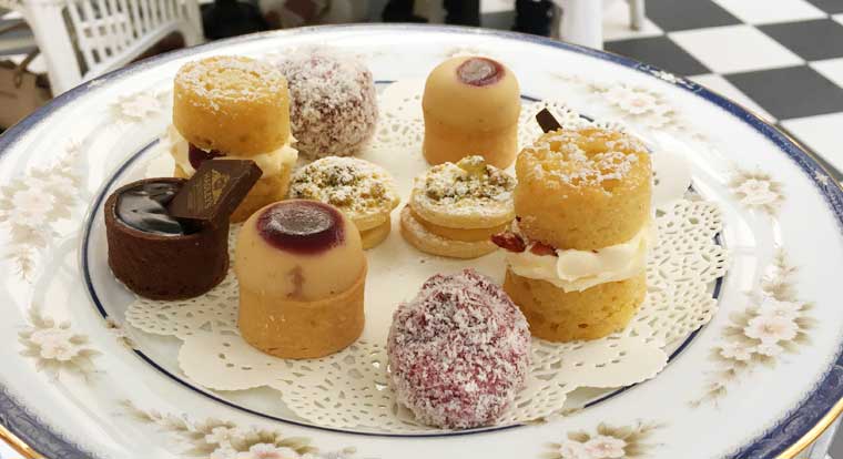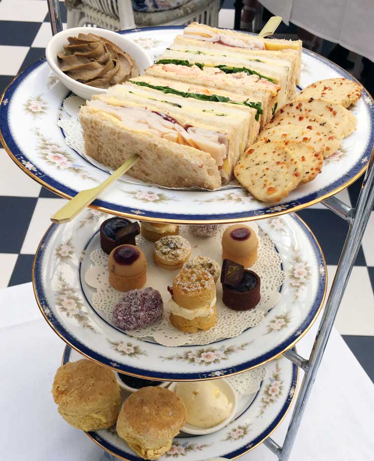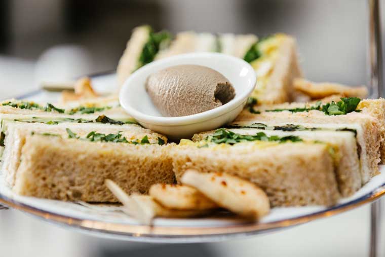 The traditional three-tiered high tea stand appears laden with treats and matches the tablewear of Noritake fine porcelain. The top layer starts with chicken liver pate with house made cheese shortbread – an interesting starter and highlight of the savoury selection in our opinion. The chef selection of sandwiches included cucumber and mint, scrambled egg with house smoked salmon & roquette and Turkey with cranberry and Brie, all skewed together for dramatic effect.