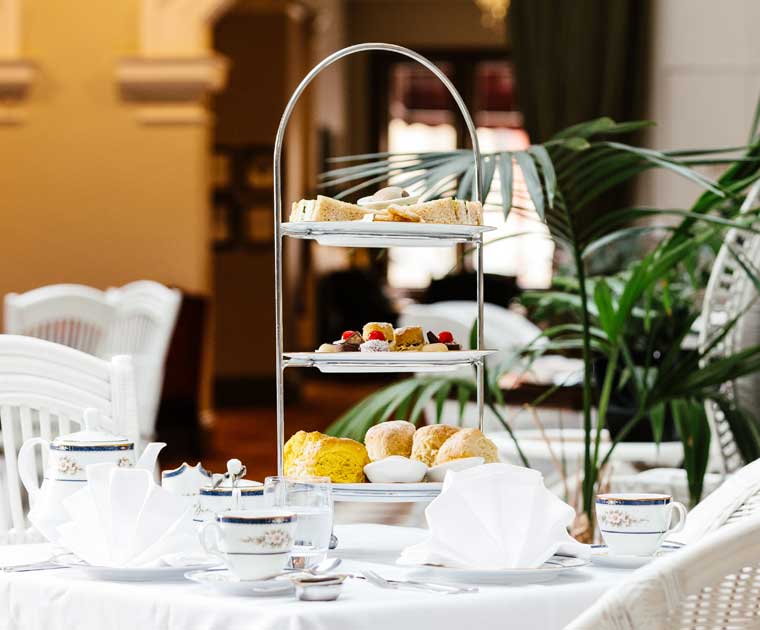 Afternoon Tea is taken in the atrium; the light filled room is furnished with white wicker furniture on a black and white mosaic checkerboard floor providing a striking effect and sense of occasion.
