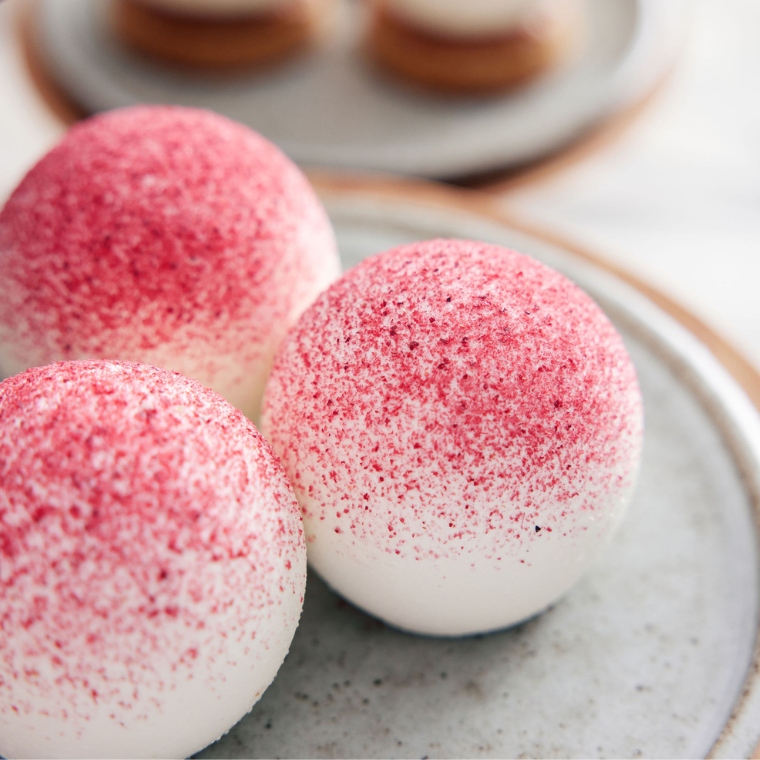 - Strawberry infusion, hibiscus flower, coconut ganache, white chocolate