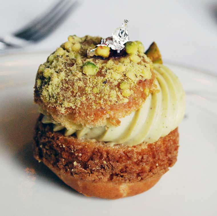 - Crispy spring choux – choux puff, crispy pistachio cream, cherry confit