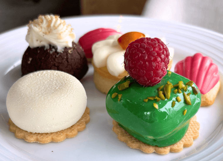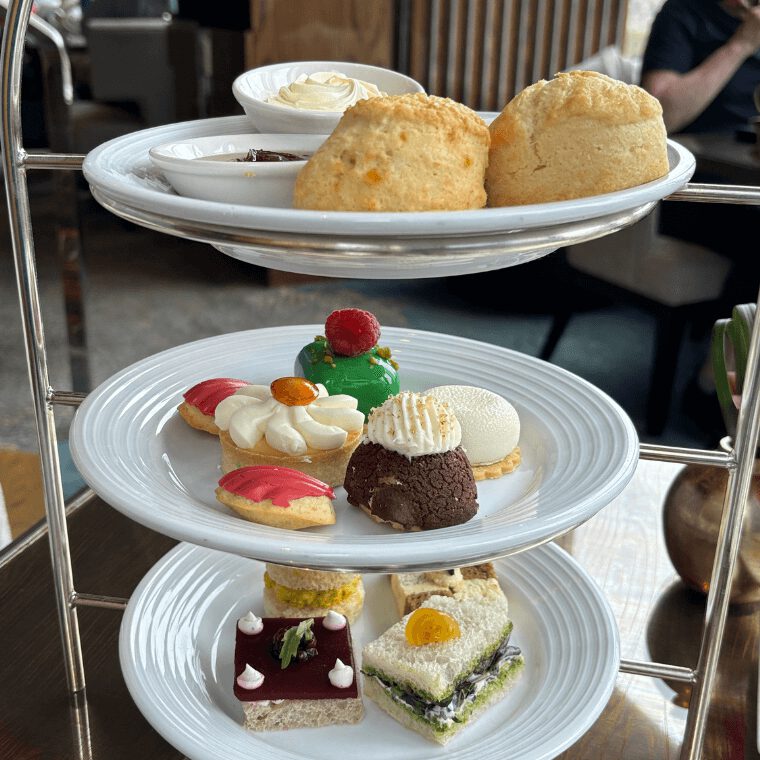 On our visit, the afternoon tea was presented in collaboration with The House of Creed, a luxury perfumery providing a multi-sensory experience. The pastry team, led by Executive Pastry Chef Jonathan Pereira, pays homage to the essence of the perfume with the handcrafted sweet selection. Each morsel is made to mirror the artistry of perfume-making, where fragrance and flavour unite. This partnership is most evident in the sweet selection, where it’s suggested the pineapple cake with coconut mousse is inspired by the fragrance Aventus, while the Carmina scent inspires the pistachio cherry cake.