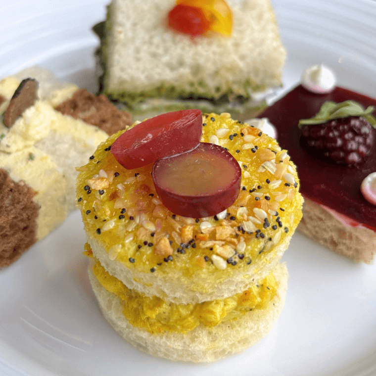 Served on a traditional three-tiered high tea stand, with white bone china plates, its presentation is one of understated elegance. We started with the tea sandwich selection, a dainty assortment of four flavourful bites. The sandwiches were modern and inventive, particularly the black truffle egg salad sandwich crafted in checkerboard style.