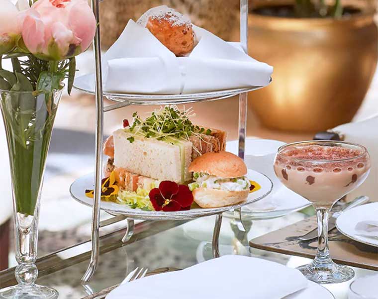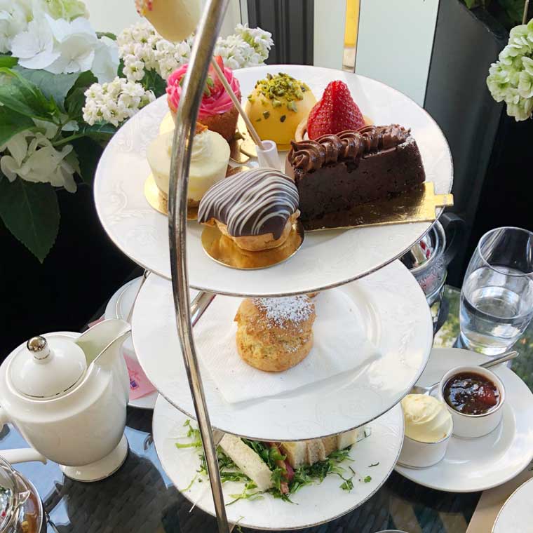 Feeling tiddly on the terrace, we busied ourselves imagining Liz Taylor would have chosen to have her afternoon tea in these glamorous surrounds – the classic glamour of the place is just so her – and was almost taken aback when our tea trays appeared in front of our eyes, laden with goodies. Realising we were, in fact, incredibly hungry, we were grateful to wolf (oh sorry, we mean ‘savour’) such delicacies as roasted pepper and avocado sliders, dainty egg and cress sandwiches on soft white bread, and a couple of cheesy pastries, and of course, a huge helping of fruity scones with buttery clotted cream and homemade raspberry jam. Despite the huge helpings, we were not shy to then move on to the hugely top-heavy cake tray, which was laden with cake pops, miniature apple crumbles, and a blueberry muffin and chocolate torte that was just so delectable we couldn’t believe it was gluten free – the chef must have been a magician.