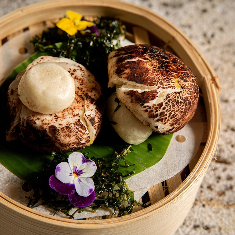 There is real flair put into the presentation here, our selection of asian savouries, a Dim Sum basket, a crispy taro dumpling and a Mushroom Bao come suspended in a golden birdcage on vividly patterned china. The crispy dumpling has our hearts and it takes real effort to not ask for another, knowing that there are many courses yet to come.