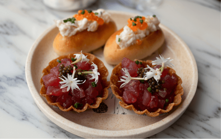 Standouts include the sashimi tuna tartlet with a hint of soy and a salty sprinkling of caviar; the chicken and celery sandwich was rich with mayonnaise and finely chopped chicken; and, the raspberry tonka crémeux which was a light vanilla mousse with a tangy raspberry filling dipped in Callebaut in the shape of an oversized raspberry – both delicious and creative..