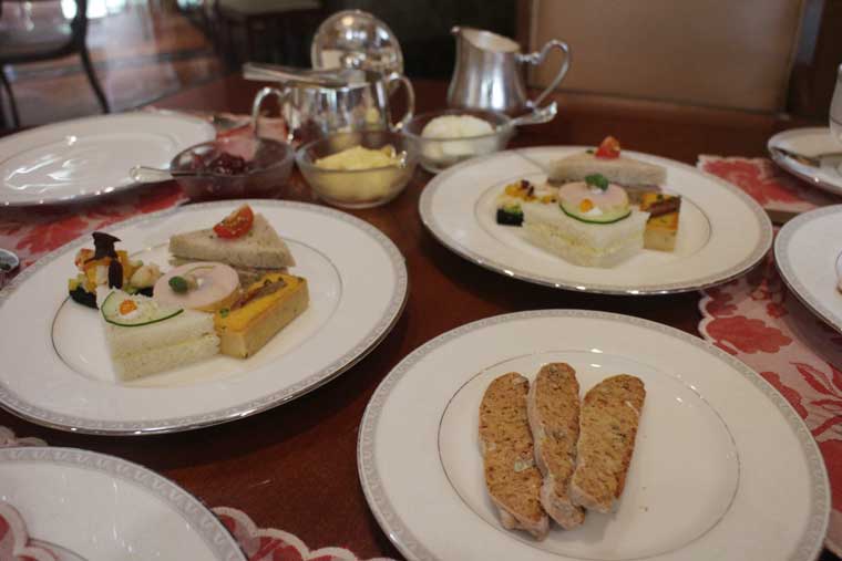 Afternoon Tea is served on white Narumi Bone China from Japan with white etchings and a pretty silver edging.