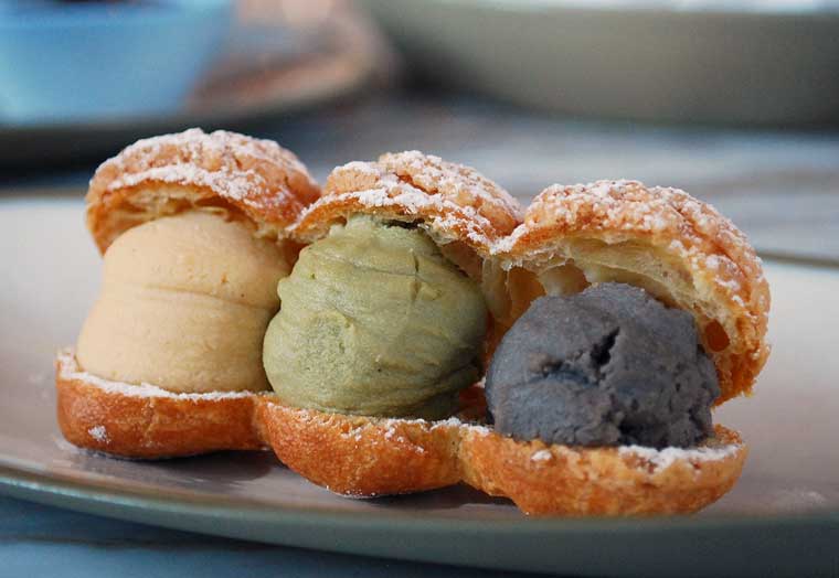 Mount Barker free range chickens in the Great Southern region are released from their barns and are free to forage from 3 weeks of age. - “Dango” profiteroles, black and white sesame, matcha crème mousseline