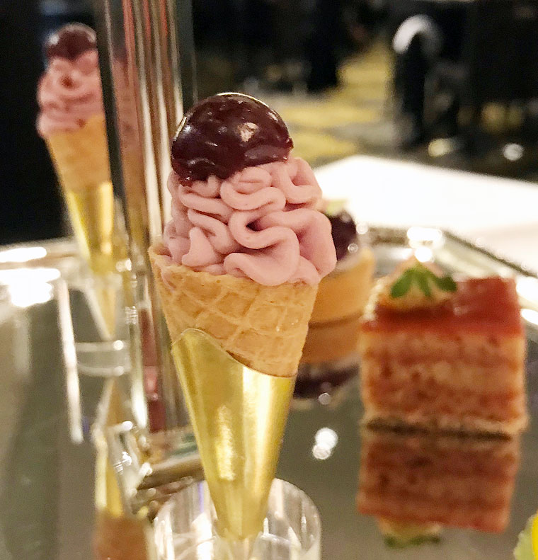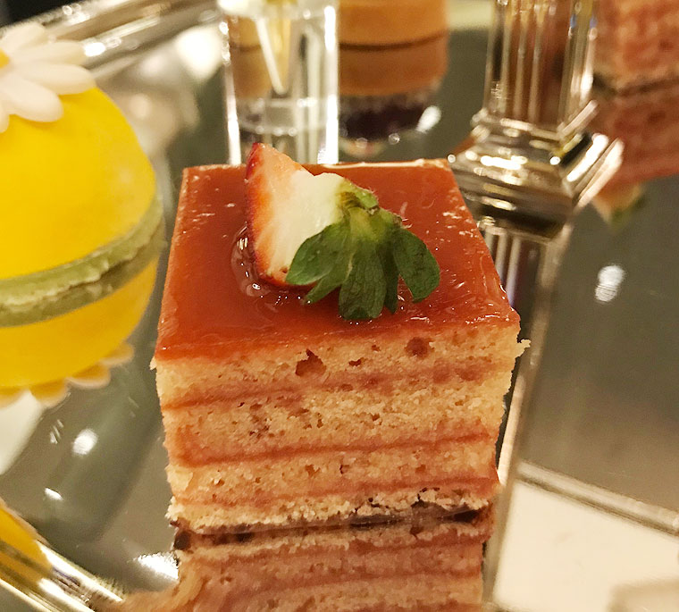 The exquisite pastries sit on the bottom level, featuring a passionfruit and blueberry tart, cherry and chocolate cone, vanilla and apricot and pistachio mousse cake. The highlight was the strawberry and rhubarb layer cake, which was light and flavoursome and dissolved inside your mouth.