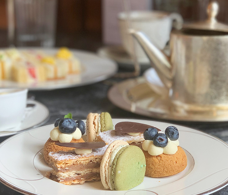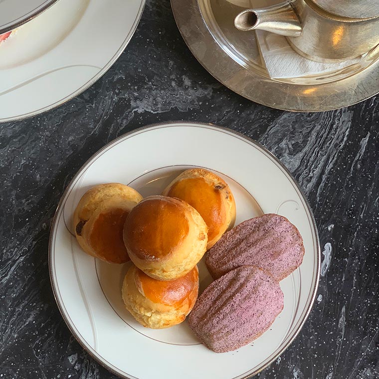 Next up is the dessert cake stand, featuring The Windsor’s signature plain and raisin scones and a hibiscus madeleine on top, followed by a beautiful pastel-coloured Earl Grey and calamansi macaron, a delectable mille feuille and a blueberry choux on the middle tier.