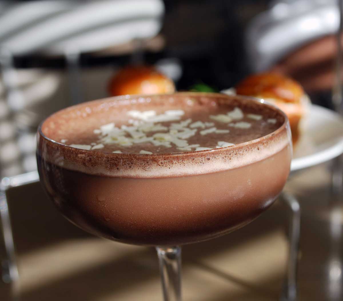 This is really a sweet tooth’s dream, with a tower full of chocolate treats. The Chocolate Martini is creamy and smooth and a unique High Tea beverage. This vodka based martini tastes like liquid chocolate and is topped with white chocolate shavings. It is so easy to drink, it can be tricky to stop at just one.