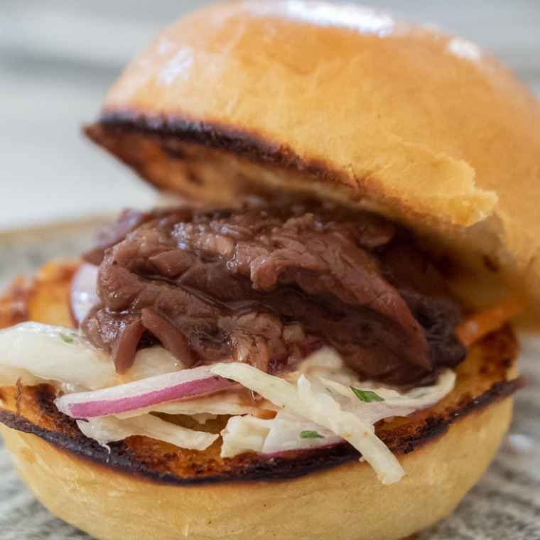 - Warm chocolate glazed beef, horseradish coleslaw, brioche
