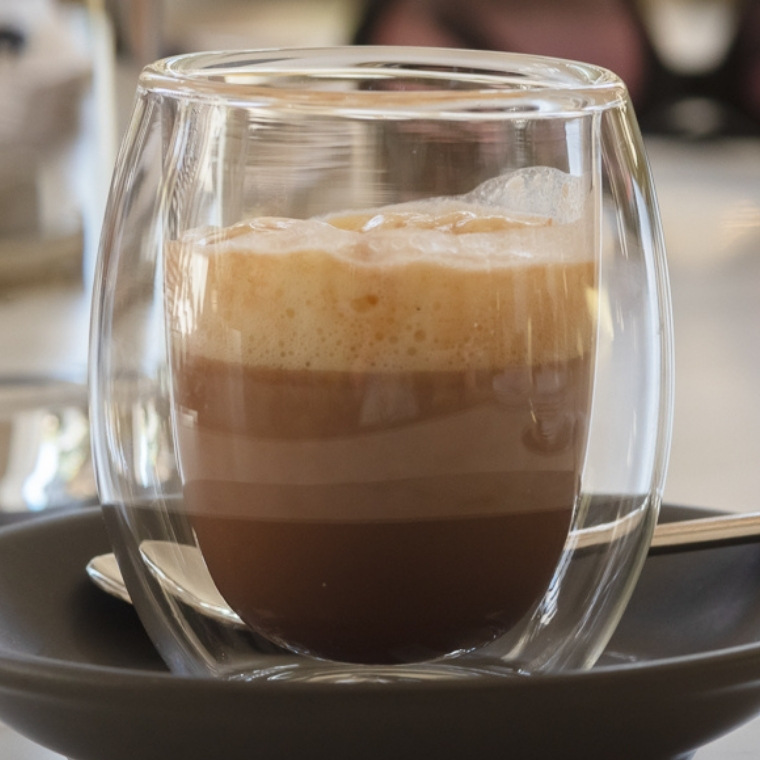 - Hot milk chocolate scented with Frangelico, caramelised honey foam.