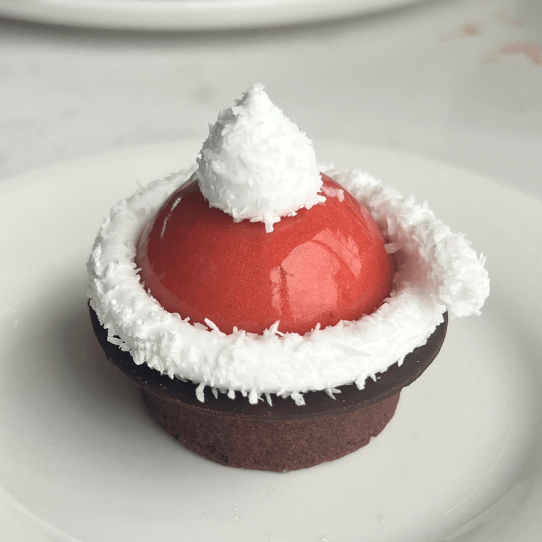 - Raspberry Santa hat with spiced brulé chocolate tart, raspberry mousse & coconut marshmallow (NF)