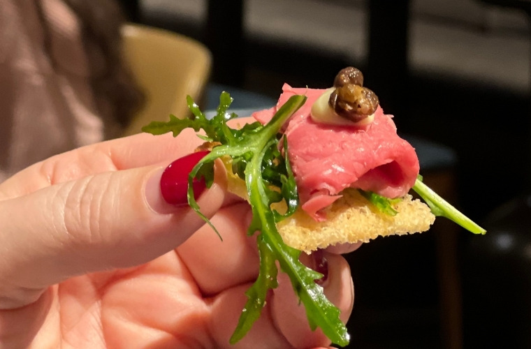 - Marinated beef, focaccia crisp, parmesan aioli, fried caper