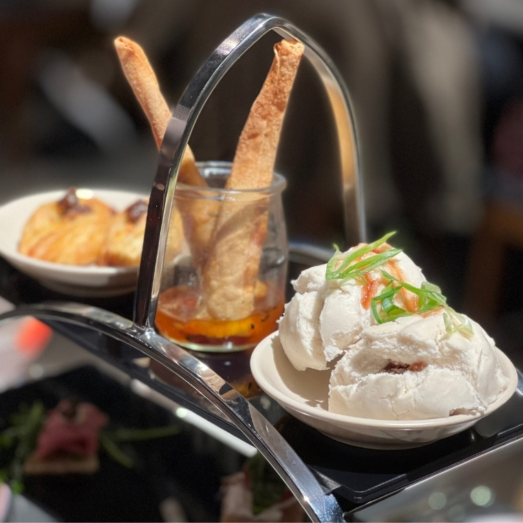 The high tea stand featured three levels of cold and hot savoury canapés – we love a high tea that has a good range of savoury. The highlights for us were the cured salmon, BBQ pork buns and prawn twisties.