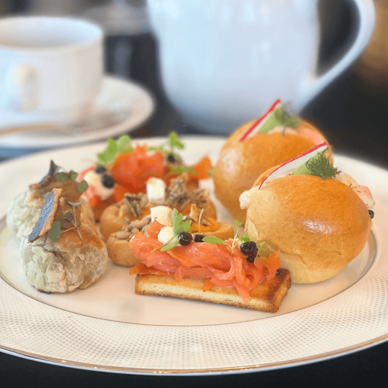 I started on the bottom tier with the lobster prawn bun with creamy remoulade and pickled cucumber. The crustacean combo was both refreshing and surprisingly light. I continued with the seafood theme and loved the smoked salmon, lemon mayonnaise, and soy pearls (my first time sampling these delightful drops of flavour) on toasted brioche. An éclair with a difference followed. This one boasted roasted pumpkin with truffle, granola, and pepitas. I left the best savoury for last, petite beef Wellington with caramelised onion purée and pancetta. The warm aromatic morsel left me wanting more.