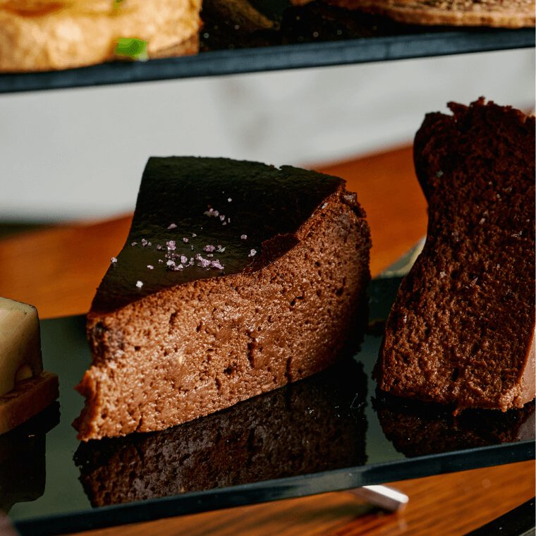 - Basque chocolate cake, Tasman pepper berry salt, featuring sustainable Cacao Trace 55% dark Chocolate, Cote d’Ivoire