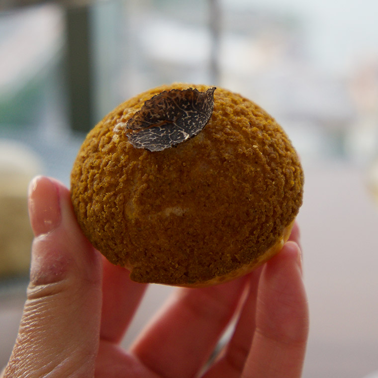 - An eclair, filled with whipped truffle brie and Shangri-La honey, topped with a delicate shaving of fresh truffle