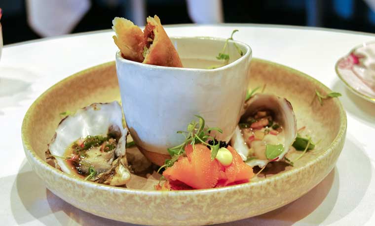 In a slight twist three canapés came out on one plate rather than part of a tier. At the centre of the plate was the showstopper, the Peking duck spring roll with hoi sin sauce and wow what a way to start?! Simply stunning both in appearance and taste. Next up was the smoked salmon blinis, or mini pancake with dill crème fraiche and caviar. The pint sized pancake packed a punch. However, it was the third canapé that really set a precedence for the decadent afternoon that lay ahead, and it’s a crowd divider, a freshly shucked oyster with chive mignonette. Fair to say I’m a fan of this contentious seafood (understatement) so this won hands down for best canapé. It was so good to see this on the menu in the first place.