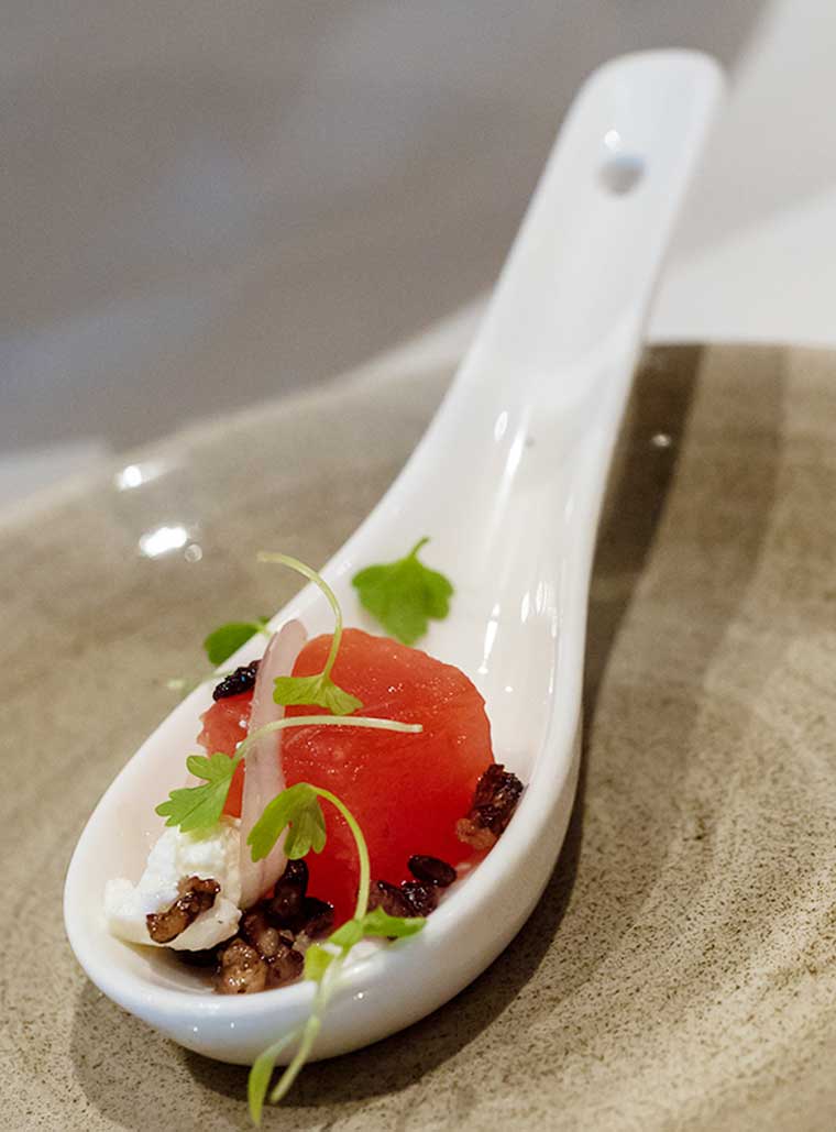- Compressed watermelon, Persian feta, pickled shallots, fried black rice