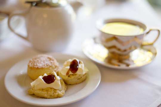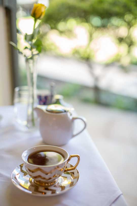 The manager, John, greets guests at the door and shows them to their tables. He was happy to tell us all about the history of house as we were walking through the rooms. There’s an assortment of tables all dressed with white tablecloths and fresh cut flowers. The rooms are large and airy, with high ceilings and chandeliers. All of the windows and French doors have views out over the gardens. The day we visited was a lovely warm Sunday afternoon so all of the doors were open and a nice gentle breeze was wafting in.