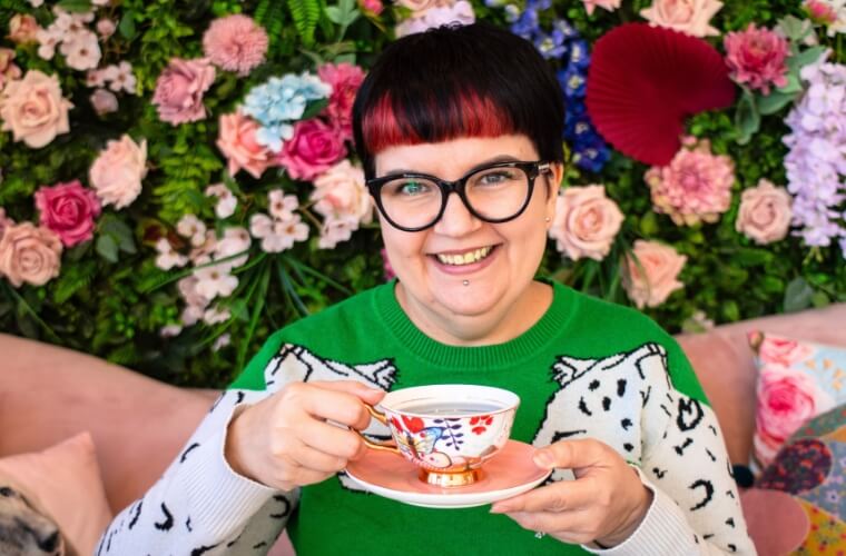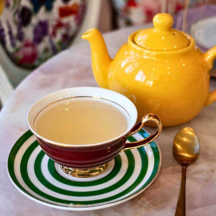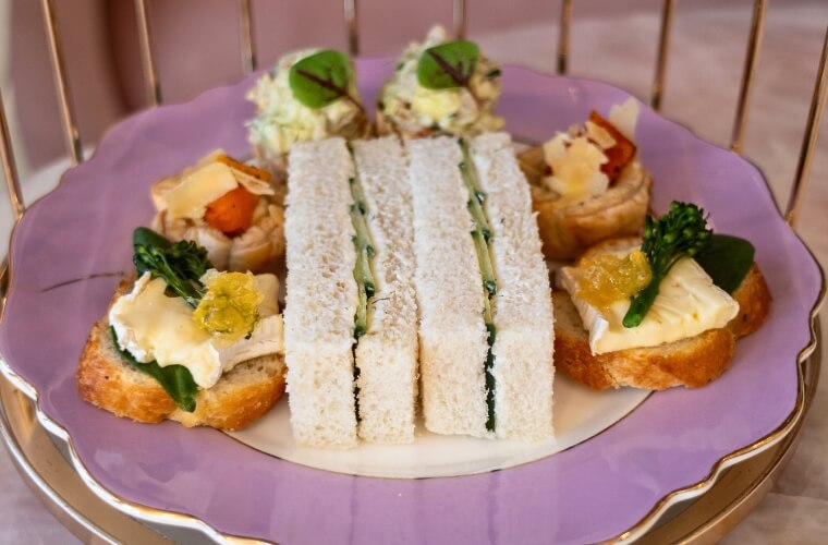 There are several rooms where high tea is served. We were in the Garden Room which felt very much like an English conservatory. Large windows along the walls bathe the room in natural light making it bright and airy. The pink quartz tables set with vintage kitsch mismatched fine boned China and the bright patterned wallpaper all serve to make it an extremely welcoming space. It turns out that Natasha is also a graphic designer and the different wallpapers throughout the rooms are her own bespoke design.