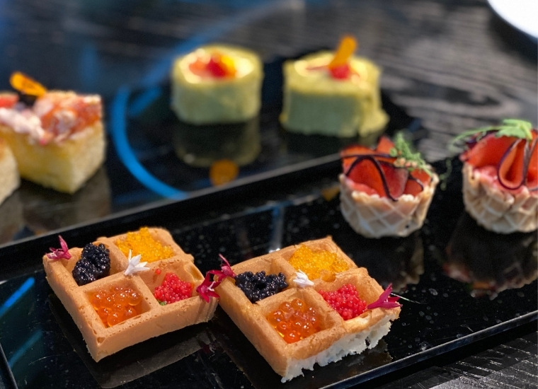 As for the savoury treats, I have never seen anything quite as refreshing as the selection before us! It is always challenging to keep the classic flavours but present them differently. In this case, they reinvented a Smoked Salmon Sandwich into a swiss roll, adding fish roe and apricot for that extra crunch. The “PBJ” Foie Gras Mousse was another interesting innovation with the sweetness from the plum jam complementing perfectly the richness of the foie gras.