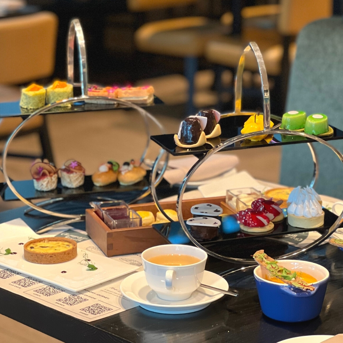 Just as we were going to start on the sweet treats, we were served two warm entrees. The Lobster Bisque was absolutely delicious. I would have preferred a thicker consistency but it overall had great umami flavour, definitely comforting to both the tummy and soul. The Quiche Lorraine also surprised me! The tart was fragrant and the insides were not too soggy. The portion was substantial enough to be savoured slowly and enjoyed between the sweet treats.