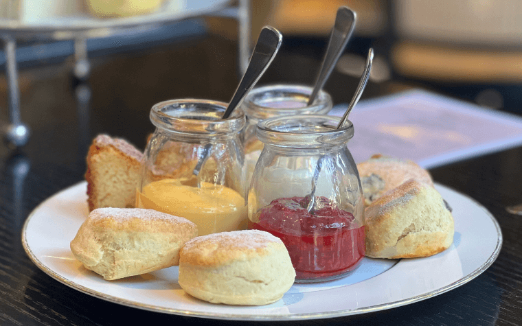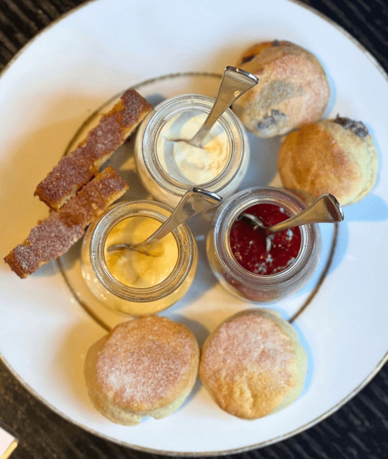 - Served with our selection of Raspberry + rose jam, passionfruit curd, Devonshire cream (gf, vg)