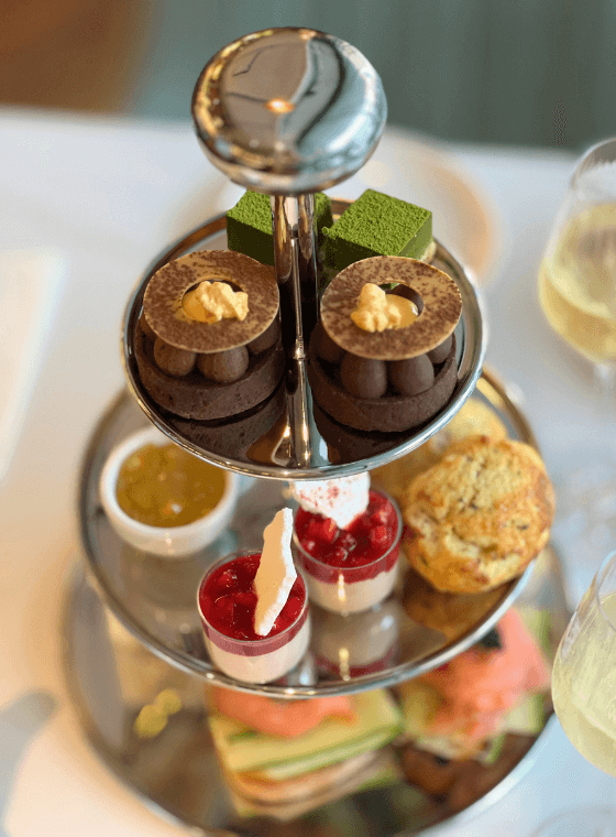 We start with a glass of Chandon, served in branded Chandon champagne glasses, and have nine teas to select from, including your standard English Breakfast, Peppermint and Camomile and a great selection of Japanese green teas including Genmaicha, Hojicha and Sencha.