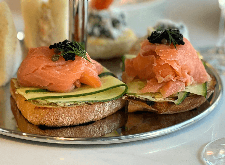 Among the standouts is an open sourdough layered with cucumber ribbons then heaped with fresh salmon and topped with caviar and capers.