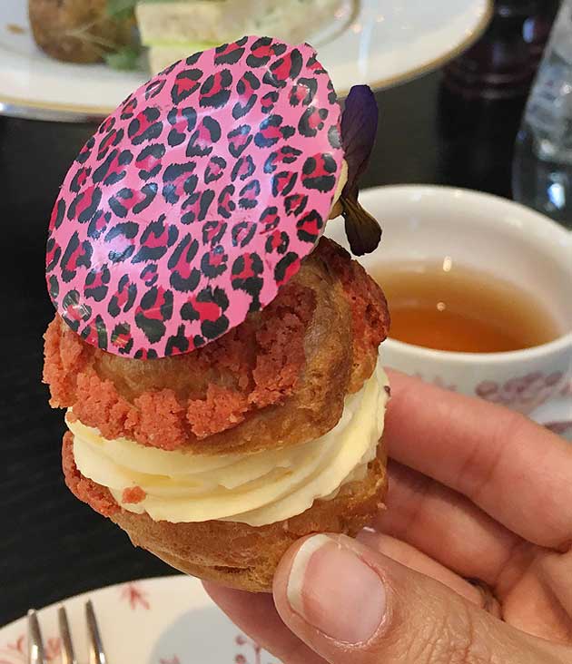 The Choux bun is topped with leopard print chocolate providing some colour, fun and whimsy to the stand, as Alex didn’t want the High Tea stand to appear too gloomy for winter. The Chocolate biscuit with Valrhona Tainori Ganache and Salted caramel is a riff on the iconic Tim Tam. Alex says “Valhrona Tainori is imported into Australia just for me, as it’s my favourite Valhrona product and it wasn’t available here.” Valhrona Tainoir is a dark chocolate couverture with 64% minimum cocoa and pure chocolate butter, making for a rich and indulgent biscuit.