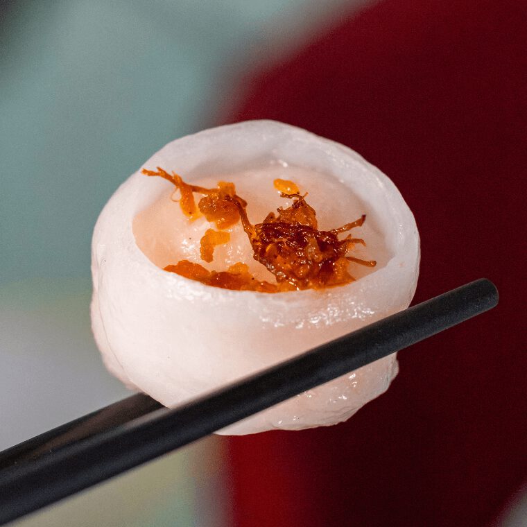 I began on the bottom tier with two beautifully barbecued tiger prawns. The chili butter was subtle and allowed the shellfish flavour to shine. Sticking with the seafood theme, I then devoured the scallop dumpling with tobiko (fish roe). Yum! Staying on the bottom tier, I loved the crispy spring roll with truffle, which, true to its word, provided a lot of crunch.