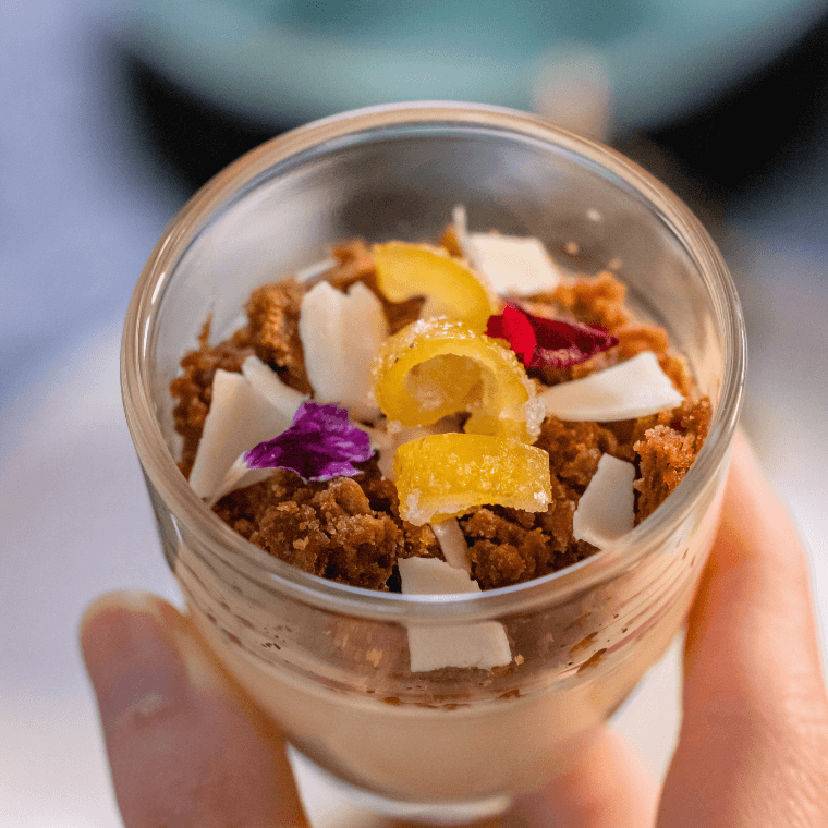 It was then time to move onto the top and final tier, the three desserts, which were accompanied by a T2 peppermint tea. The Green Tea-Soaked Ladyfingers with Matcha Mascarpone layers did not disappoint. The subtle layers of sponge and cream with chocolate trim were the perfect chaser to the rich, meaty flavour of the beef slider. The dish of the day was next; the Spiced Mandarin Panna Cotta with Orange Jelly was a-mazing! The creamy layers were perfectly showcased in a round glass, and every mouthful was better than the last. I finished up the day with the fruity, handcrafted macaron.