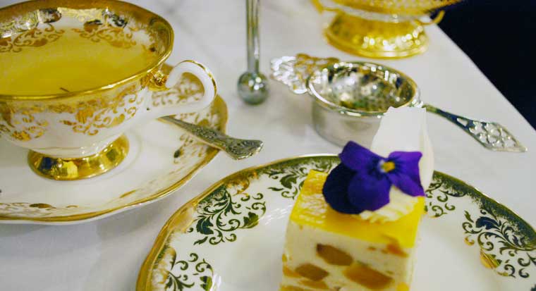From the emerald green printed wallpaper to the chandeliers and the white and gold fine bone china, the decor is pure old-world charm. To complete the look, there’s also a crystal bowl on the table full of brown and white sugar cubes, and a silver tea strainer.