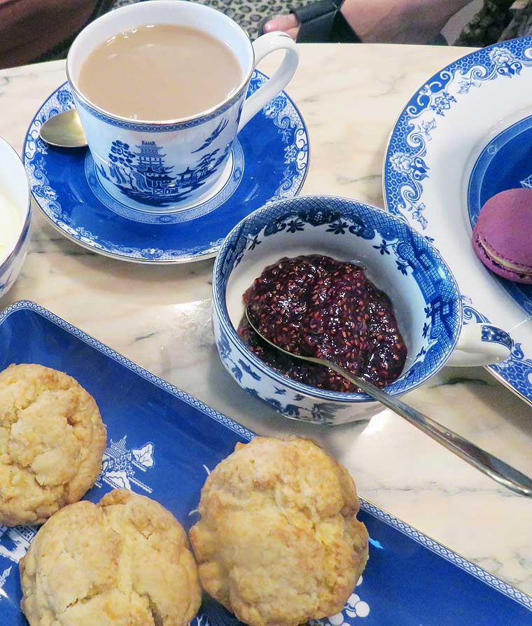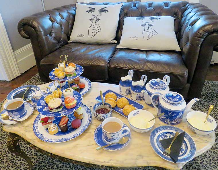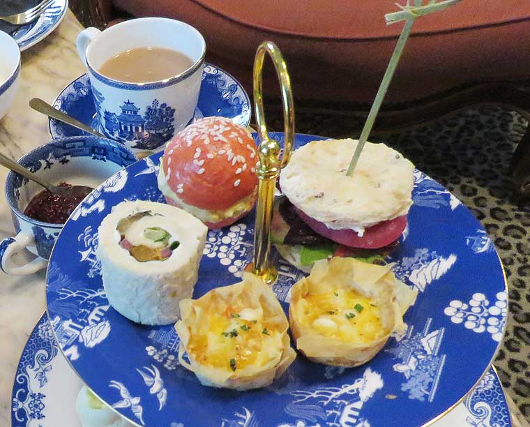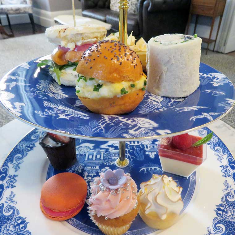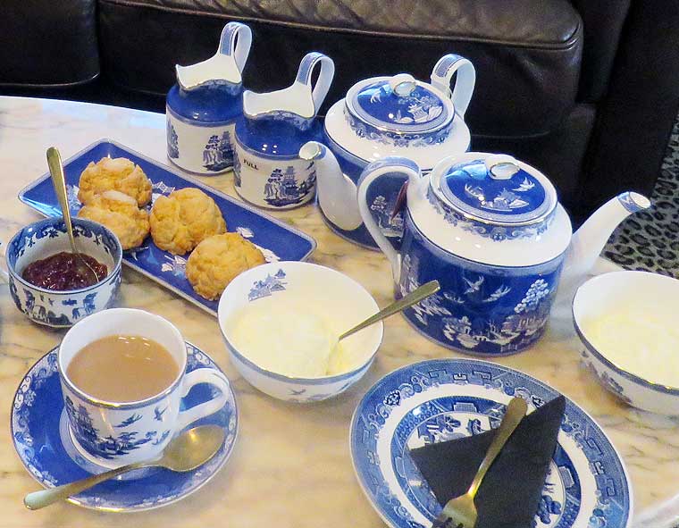 Welcomed by the Functions Co-ordinator, Mandy Wibowo, we were led to our low-lying marble table, set with blue and white Johnson Brothers china, for our high tea within the grand lounge room – with lofty ceilings, chandeliers, marble fireplaces, vases of fresh flowers, Persian carpets and antique furnishings.