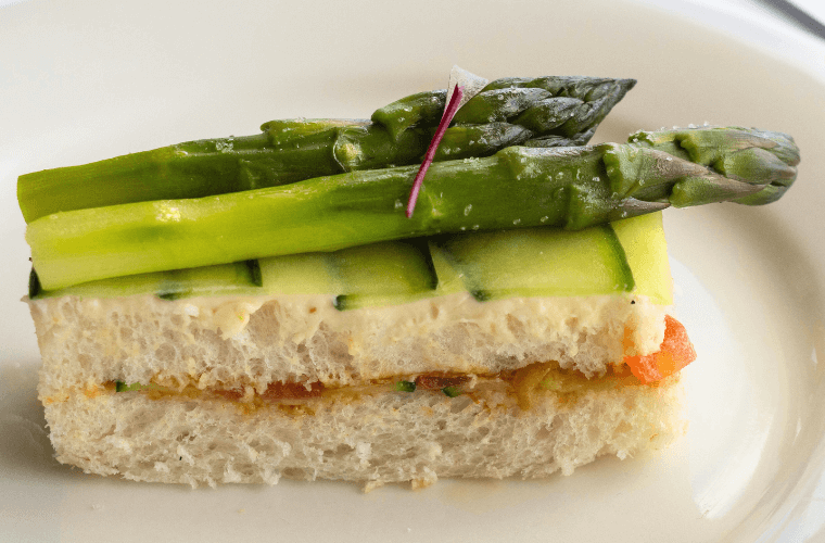 - Cucumber, tomato, cream cheese, asparagus, white bread