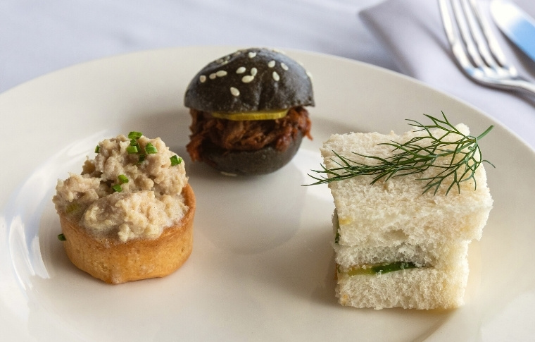 The Wintergarden menu has a substantial selection of sandwiches with the traditional trio of egg, cucumber and smoked salmon each making a tasty appearance. Backed up by a lamb wrap, a mini slider and a chicken tart the savoury options were plentiful.