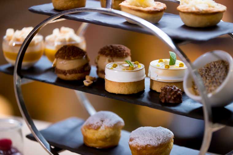 Seated comfortably on plush, comfy sofas, we were filled with anticipation. We’d never had a ‘buffet’ style high tea before, and had been informed that the tables would be waiting for our feast very shortly. In the blink of an eye, large glasses of crisp, sparkling champagne had appeared before us, and, in the time it took to clink cheers, we were welcomed to take a plate and visit the food tables, that lay waiting for us, heaving with delights.