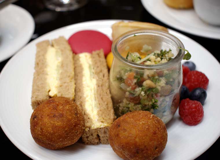 We were so bowled over by the choice at the buffet, that we were quite in daze, not knowing where to begin piling our plate. But, we had to start somewhere, so we started savoury. Odes to tradition fused with innovation at the hot food bar. A quiche Lorraine, and high tea mainstays, such as an egg and cucumber, and salmon and baby spinach sandwiches, also lay astride a marvelous Moroccan harissa lamb pie, a shitake mushroom arancini, all executed with considerable aplomb.